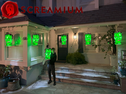 Hang the Giant Frankenstein's Monster Lantern outdoors or indoors to create the ultimate Halloween ambiance for your home or business! This big Frankenstein pendant lamp prop from SCREAMIUM features scary details such as sunken eye sockets and a big, gnarly mouth. An internal light illuminates the undead head in dark environments, inside or outside. Fully water resistant and durable, this outdoor Halloween decoration can withstand harsh wind and weather. When viewed in person, you'll experience the amazing artistry of this monster masterpiece. Formed from translucent polyresin material in a roto mold and hand-painted by highly skilled airbrush artisans, each monster is a work of art unto itself!
