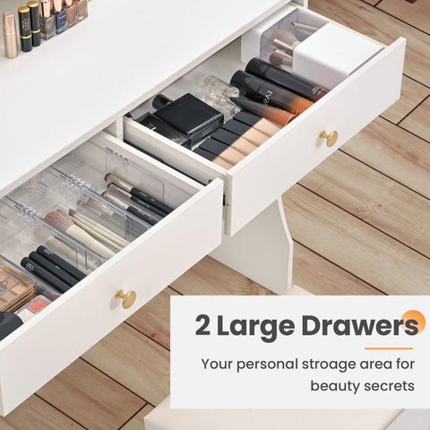 The 38.8" wide desk pairs a luminous LED mirror (38.8"x20") with 4 whisper-quiet drawers and a multi-functional storage stool. Golden handles and crisp white MDF create boutique-worthy aesthetics, while 3 lighting modes (3500K-6500K) and built-in outlets transform it into a complete beauty hub. Ideal for teens, small bedrooms, or as a thoughtful gift.