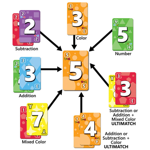 Cooperate to match cards and make your way up the pyramid as a team in this exciting, colorful, addictive game. Make clever matches by number or color. Will you use 1 card or 2? Addition or subtraction? Mix colors (yellow + blue = green)? Will you risk a card now or save it for later? Can you guess what card the other player needs? Make a perfect match of both number and color to feel the thrill and gain the rewards of an Ultimatch!