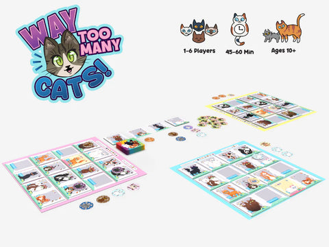 In Way Too Many Cats, players each run a cat shelter and try to make the cats as happy as possible, so they can get adopted! Each cat wants different things, with some cats being a bit more particular than others. Balance making adult cats happy while also not getting too many kittens and you'll end up with the cutest set of cats!
