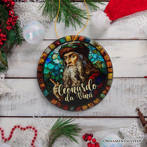 Honor the genius of Leonardo da Vinci with this exquisite ornament, featuring a striking stained-glass depiction of the Renaissance master himself. The intricate design brings an aura of timeless creativity and intellectual brilliance to your holiday décor, perfect for admirers of art, history, and innovation. This ornament adds a refined, cultured touch to any Christmas tree, celebrating the spirit of discovery and artistic mastery that defined da Vinci's legacy. A unique keepsake for those who appreciate the beauty of the past with a modern twist. 🎨🖋️