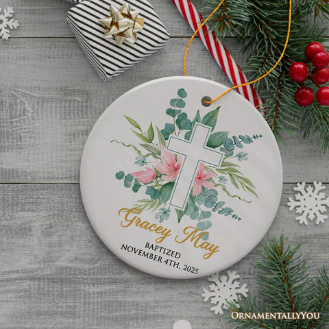Baby Baptism Christening Custom Cross Ornament, Personalized Baptized Child with Flower Keepsake