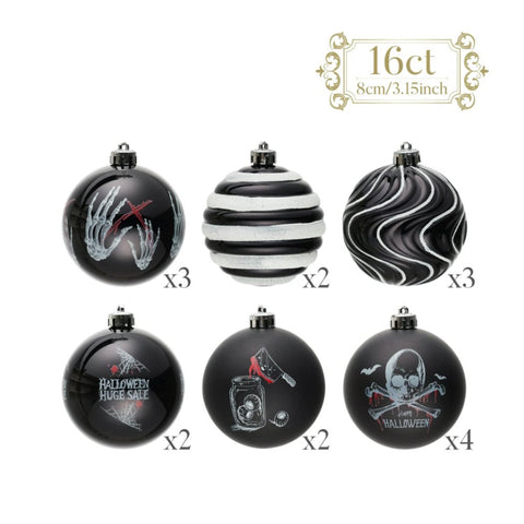 Set the perfect spooky mood with this 16-Piece Halloween Ornament Set, crafted in a dramatic black, white, and silver palette. Each bauble features bold gothic and horror-inspired designs, including skulls, skeleton hands, bloody cleavers, creepy jars, and spiderweb accents, along with striped and swirled patterns for balance.