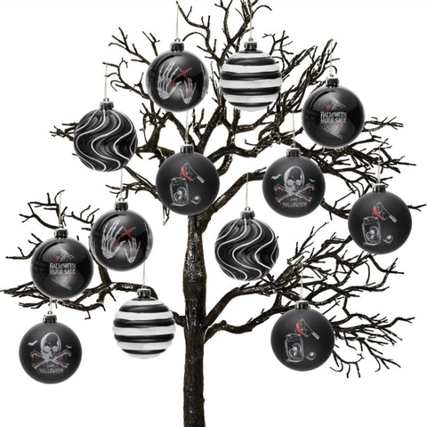 (Pre-Order) Black Gothic 16-Piece Baubles with Skulls, Skeleton Hands, Horror Prints & Striped Designs
