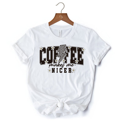 Coffee Makes Me Nicer Retro T-Shirt, Trendy White and Natural Tee for Stylish Women and Caffeine Lovers
