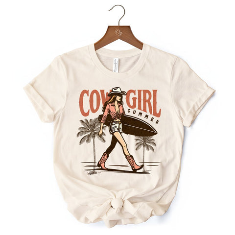 Cowgirl Summer Surf T-Shirt, Retro Western Beach White and Natural Tee for Free-Spirited Women