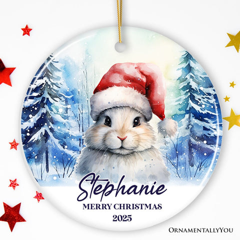 Cute Bunny with Santa Hat Personalized Ornament, Winter Forest Christmas Gift With Custom Name and Date