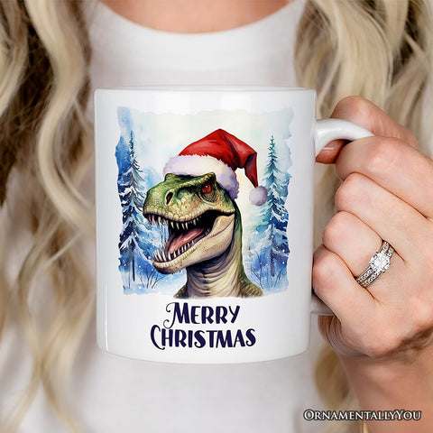 Dinosaur with Santa Hat Personalized Mug, Winter Forest Christmas Gift With Custom Name and Date