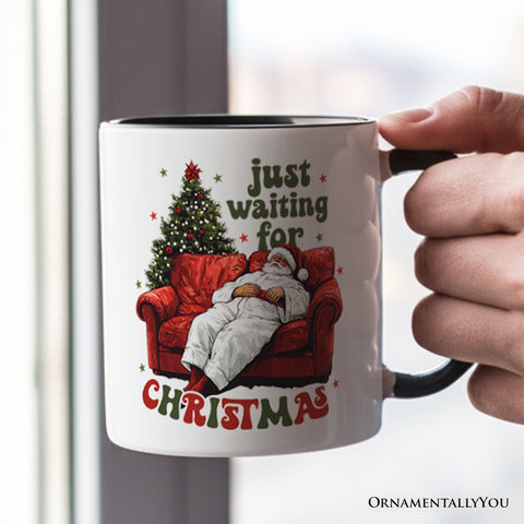 Funny Fat Santa Couch Personalized Mug, Just Waiting for Christmas Gift with Custom Name