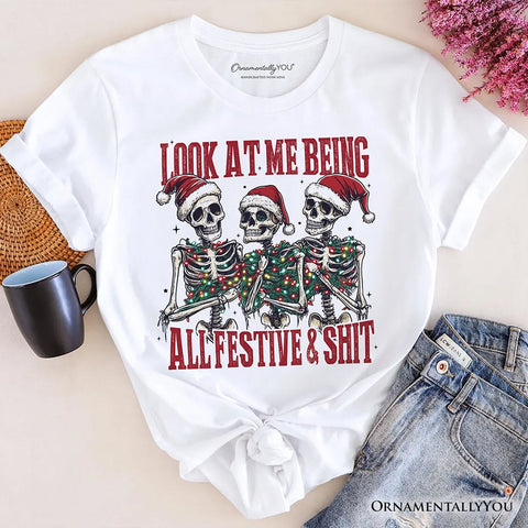 Get into the holiday spirit with a twist of humor in our Funny Skeletons in Santa Hat Christmas T-Shirt 🎅💀. Perfect for those who love a sarcastic touch to their seasonal wardrobe, this comfy unisex tee features a quirky skeleton wearing a festive Santa hat, paired with a witty "Look At Me Being All Festive" statement. Made from soft, breathable fabric, it’s ideal for casual winter gatherings, office parties, or lounging at home with hot cocoa ☕❄. A must-have for lovers of dark humor, edgy Christmas style, and anyone who prefers their holiday cheer with a side of sass. Great gift idea for friends, coworkers, or family members who enjoy a laugh during the holidays.