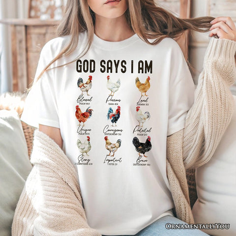 God Says I Am Christian T-Shirt, Rooster and Chicken White Tee for Farm Style Lovers
