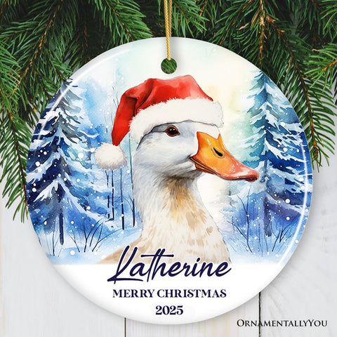 Goose with Santa Hat Personalized Ornament, Winter Forest Christmas Gift With Custom Name and Date