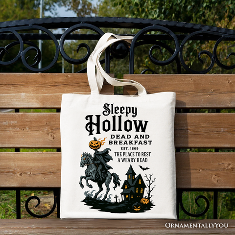 Perfect for spooky season fans and gothic literature lovers, this Headless Horseman Sleepy Hollow canvas tote bag features a retro “Dead and Breakfast” design inspired by classic Halloween folklore. Made for everyday use, this reusable tote is ideal for shopping, books, errands, or fall festivals, blending dark humor with timeless horror style. A must-have Halloween accessory, it makes a unique gift for horror fans, teachers, book lovers, and anyone obsessed with vintage spooky vibes. Durable, eco-friendly, and eye-catching, this gothic Halloween tote bag adds personality to any outfit while showing off your love for eerie legends 🎃🖤👻