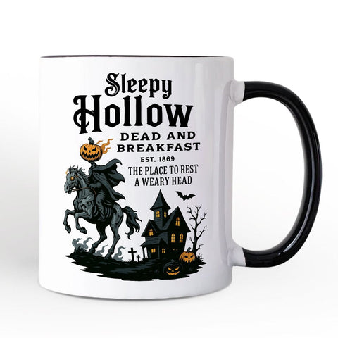 Bring eerie charm to your morning brew with this spooky Sleepy Hollow-inspired Halloween mug, featuring a hauntingly fun "Dead and Breakfast" design and the iconic Headless Horseman. Perfect for horror lovers and retro-style collectors, this personalized cup adds a ghoulish twist to your coffee or tea ritual. The vintage aesthetic paired with custom name personalization makes it an unforgettable seasonal gift for Halloween parties, haunted home dΓ©cor lovers, or autumn birthdays. Printed with non-toxic sublimation on a high-quality ceramic mug, itβs both microwave and dishwasher safe for everyday use. A wickedly delightful addition to your spooky kitchenware! βππ»