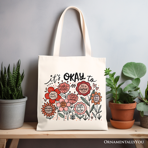 It's Okay Floral Affirmation Canvas Tote Bag, Boho Motivational Gift for Kind and Inspirational Women