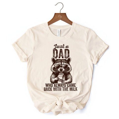 Just a Dad Who Back With Milk Raccoon T-Shirt, White and Natural Funny Tee for Loyal and Cool Fathers