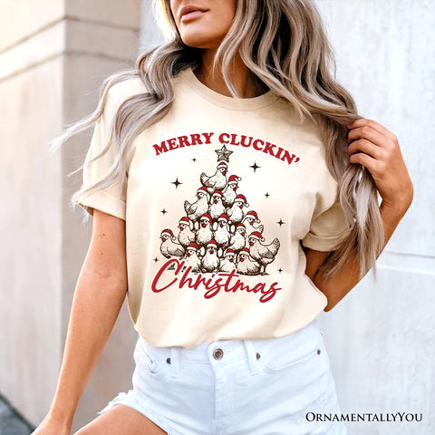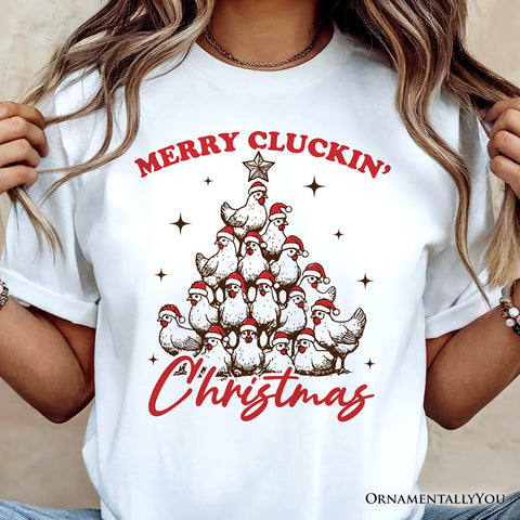 Merry Cluckin' Christmas Tree T‑Shirt, Funny Santa Hat Chicken Farmhouse Tee
