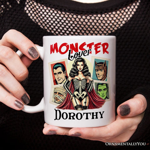 Monster Lover Personalized Halloween Mug, Horror Characters Retro Gift for Women with Custom Name