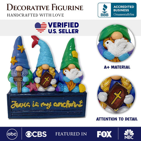 Discover the perfect blend of whimsy and faith with these vibrant nautical-themed gnome figurines, a delightful addition to any beach house, garden, or shelf display. Featuring three colorful gnomes, each adorned with sea-inspired motifs like starfish and seashells, and holding symbols of Christian faith, including a cross and a dove. The base is charmingly inscribed with "Jesus is my anchor," making it not only a decorative piece but also a heartfelt expression of spiritual grounding. These figurines are ideal for enhancing a coastal decor theme or as a thoughtful gift for loved ones who cherish both their faith and the sea. Bring a splash of joy and color to your space with these enchanting seaside guardians! πβ¨