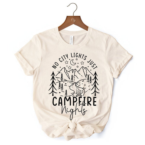 No City Lights Just Campfire Nights T-Shirt, White and Natural Camping Tee for Stargazing Campers