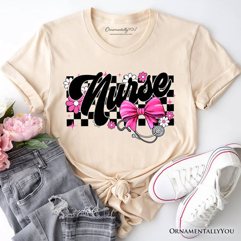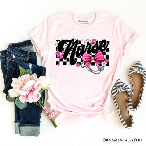 Nurse Floral Coquette Pink Bow T-Shirt, Retro Stethoscope Checkered Tee