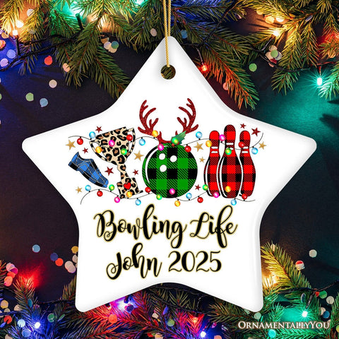 Personalized Bowling Buffalo Plaid Leopard Christmas Ornament, Ball Pins and Trophy