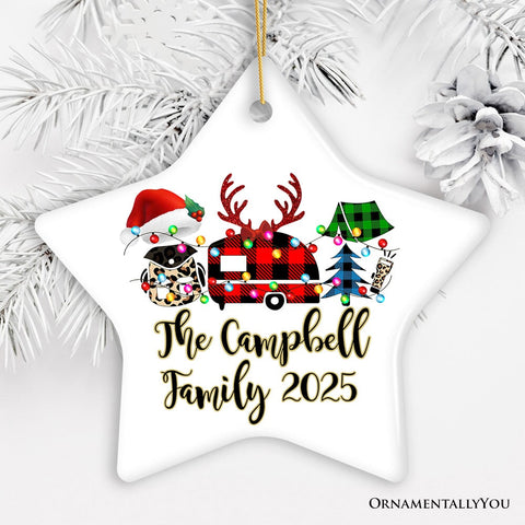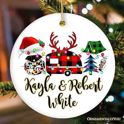 Personalized Camp Buffalo Plaid Leopard Merry Christmas Ornament, Camping Friends Gift