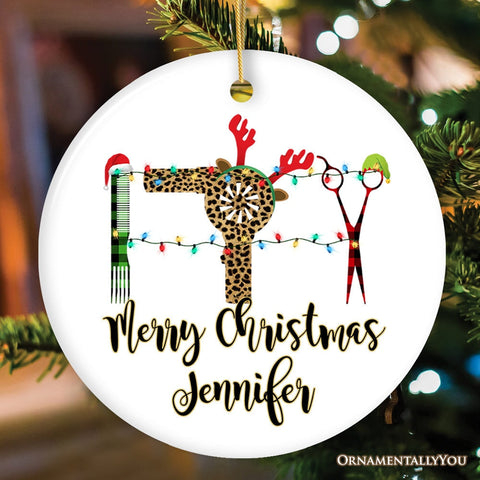 Personalized Hairdresser Buffalo Plaid Leopard Merry Christmas Ornament, Stylist Gift