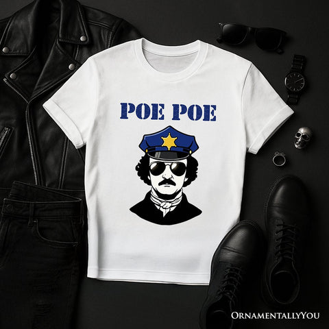 Show off your love for dark humor and classic literature with this witty and stylish tee featuring a clever police-themed twist on the legendary author of gothic horror. Perfect for bookworms, Halloween fans, or law enforcement with a literary side, this comfortable and eye-catching shirt combines clever wordplay with bold navy and white tones for maximum effect. Whether you're headed to a spooky gathering, bookstore event, or just want to spark some smiles, this tee delivers both brains and laughs. 📚👮♂️🦉🖋️
