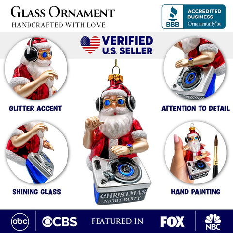 DJ Santa Spinning Christmas Party Glass Ornament, Headphones and Music Star Hipster Tree Decor