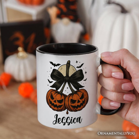 Pumpkin Cherries Coquette Bow Personalized Mug, Retro Halloween Gift with Custom Name