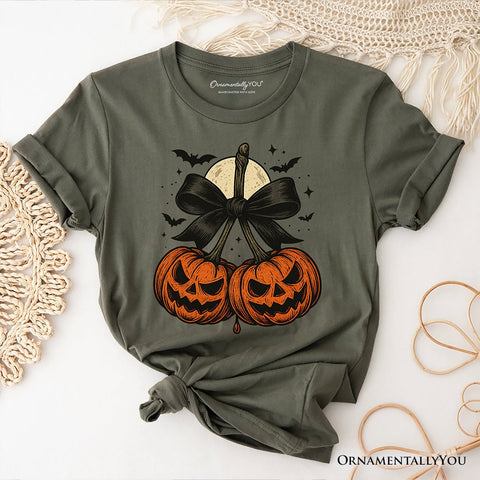 Pumpkin Cherries Coquette Bow T-Shirt, Retro Halloween Fall Season Tee for Sweet Autumn Girls