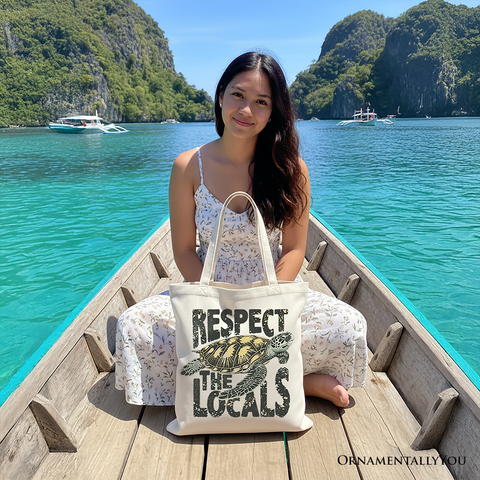 Respect the Locals Turtles Canvas Tote Bag, Retro Grunge Gift for Ocean and Beach Lovers