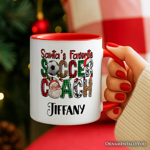Santaโs Favorite Soccer Coach Personalized Mug, Plaid Christmas Football Gift with Custom Name