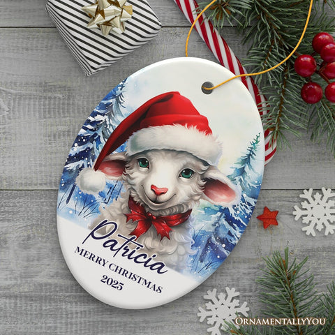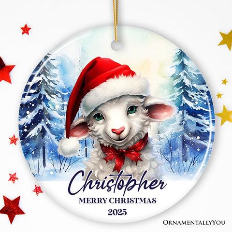 Sheep with Santa Hat Personalized Ornament, Winter Forest Christmas Gift With Custom Name and Date