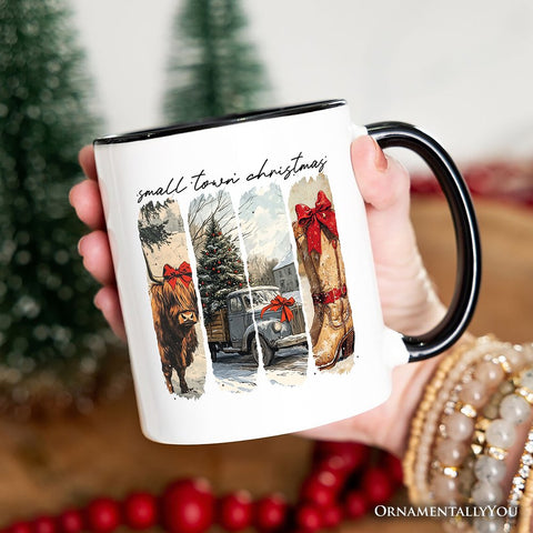 Small Town Christmas Personalized Mug, Highland Cow Rustic Western Cowgirl Holiday Gift with Custom Name