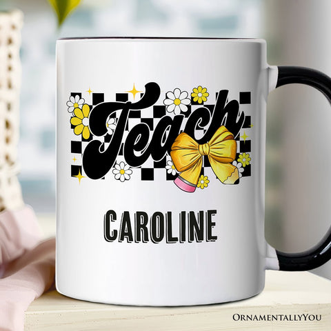 Teach Checkered Coquette Bow Personalized Mug, Retro Gift for Trendy Teachers with Custom Name