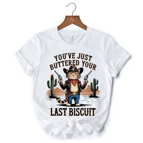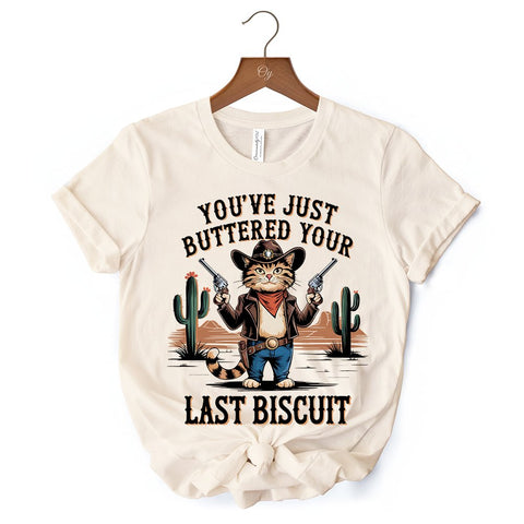 You've Just Buttered Your Last Biscuit T-Shirt, Cute Cowboy Cat Western Retro White and Natural Tee for Country Style Lovers