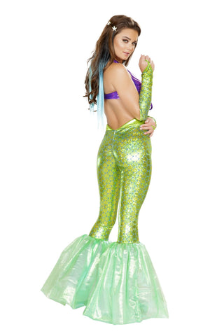 Includes Haltered Tie Top with Sea Shell Look, and High Pants with Zip-up Back Closure and Iridescent Mermaid Tail