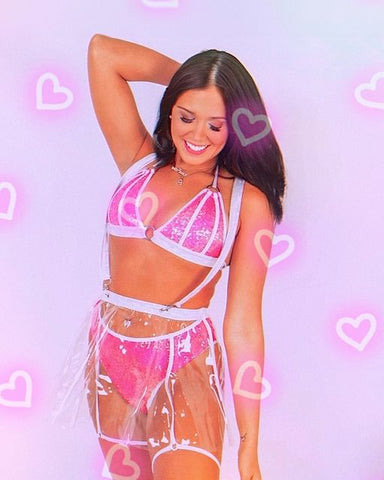 Add a flirtatious flair and unique vibe to any rave outfit with our Clear Vinyl Flare Skirt with Suspenders. This piece fits over any rave outfit, from rompers and bodysuits to bikini sets and rave shorts. The clear vinyl skirt flares out for a fun and flirty feel but is completely transparent, so you can still show off the rest of your outfit underneath. The suspenders clip on comfortably and securely, and the wide waistband on the skirt helps keep it in place throughout the night.