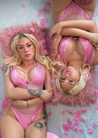 Plunge neckline, Rhinestone fishnet, Fold over elastic trim