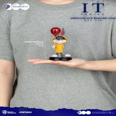 From Beast Kingdom. Celebrate 100 years of Warner Bros. with an incredible new crossover collection from Beast Kingdom's Mini Egg Attack series! This release showcases two iconic characters from the Looney Tunes and IT series: Bugs Bunny and Pennywise the Clown. Bugs Bunny takes on the appearance of the Little Boy from IT, while Daffy Duck undergoes a startling transformation into Pennywise himself. The figurines capture the essence of these characters, complete with iconic elements like the infamous red balloon and a yellow raincoat. These small yet intricately detailed figurines offer the perfect way to commemorate 100 years of Warner Bros. magic!