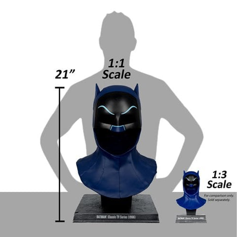 The classic cowl of Adam West's Batman from the 1966 TV Series can now be yours! It measures approximately 21-inches tall including the base. A display stand is included to showcase this iconic mask.