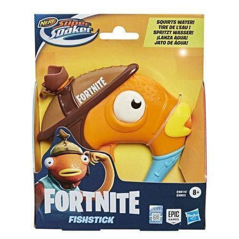 Make a big splash with this micro-sized Nerf Fortnite Super Soaker water blaster! It captures the look of the Fortnite Fishstick character from the popular video game. Fill it with water and fire up lots of water-blasting fun. Open the cap and fill the tank, then close the cap and press the trigger to unleash a stream of water. The miniature size is easy to carry so you can start a water battle almost anywhere, anytime. Look for all the Nerf Super Soaker Fortnite water blasters (each sold separately) -- they're great for backyard battles and outdoor parties with family and friends, and they make awesome gifts and party favors!