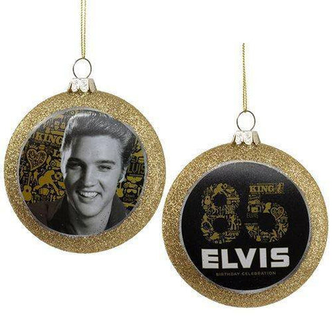 Remember the King of Rock and Roll. This gorgeous black-and-gold Elvis Presley 85th Birthday 3-Inch Glass Disc Ornament is a marvelous addition to any fan's collection. Surrounded by gold glitter, it's two-sided and hangs from a gold string. One side features a fan-favorite picture of Elvis, while the other side says, "85 - Elvis - Birthday Celebration." Don't miss it!