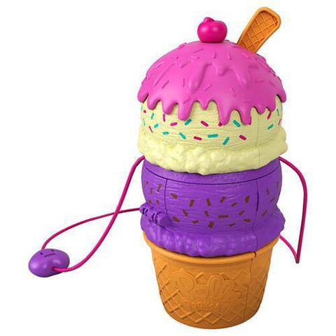 Get ready for Theme Park Adventures with Polly Pocket! The super-sweet Spin 'n Surprise Playground is shaped like an ice cream cone and has a lid that opens and 3 levels that spin out to reveal 3 floors of fun. The playset also features 25 themed surprises including micro Polly and Lila dolls and Polly's dog Peaches (each doll has 5 movable joints for pose and play action). Get the fun started at the Playground that includes a hot air balloon; a banana split see-saw; ice cream sandwich and ice cream cone fountains (use the syrup bottle accessory, fill with water and place in the ice cream sandwich top to shoot water up or in the ice cream cone to make water come down); and a sliding pole. Some accessories have a Pop & Swap peg feature that can be placed in different areas of the playset for even more versatility. Kids can play out Playground adventures inside or outside of the playset with the accessories and then easily pack it up to take on the go! Playset also includes a long shoulder strap to carry it like a purse, too.