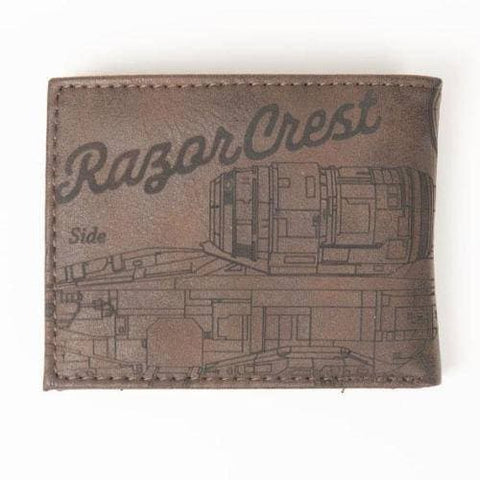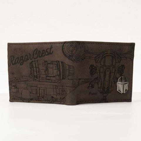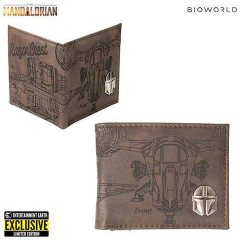 Entertainment Earth Exclusive! Whether you're engaging in cosplay or just need to freshen up your wallet game, this Star Wars: The Mandalorian Etched Print PU Bifold Wallet should do the trick. Made of brown PU, it features a black etched image of Mando's Razor Crest ship and a metal embellishment of his helmet on the exterior. Inside, you'll find 3 card slots, a window ID slot, and a bill compartment. The wallet comes packaged in an open window box. It measures approximately 3 1/4-inches tall x 4 1/4-inches wide x 3/4-inch thick (when empty). When opened, it measures approximately 8 1/4-inches wide. Get yours while you can!
