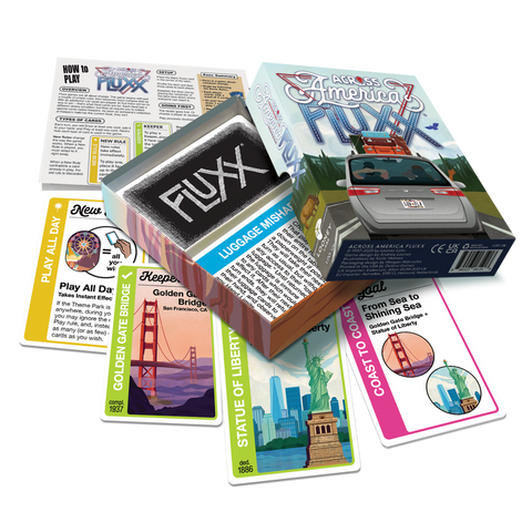 Road trip! The ever-changing card game is hitting the road and seeing the sites on a drive across the United States of America. From famous landmarks to national parks, it’s got everything from the Golden Gate Bridge to the Statue of Liberty, including the Grand Canyon, Hollywood, Cape Canaveral, Devil’s Tower, the monuments of DC, and, of course, Amusement Parks. Perfect for vacationers or armchair travelers, Across America Fluxx includes a few special twists, including the New Rule "Play All Day" and an Action called "Route 66." Who calls shotgun?