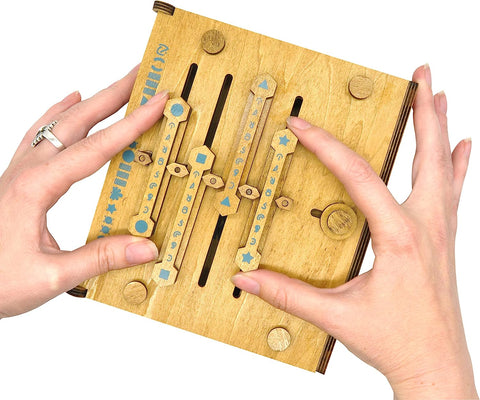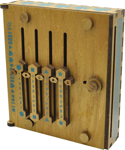 This unique puzzle box is inspired by the book-binding technology developed by the Ancient Romans during the reign of Caesar. The Roman Codex is considered by experts to be the first modern book, establishing the basic shape and form that we still use today. Finding the correct position for the sliders requires you to solve the puzzle of the mysterious symbols painted all over the box. Once you figure it out, this puzzle box can be reused as a little hiding place. There is space inside for a secret note or to store some cash. Can you crack the code(x)?!? Difficulty 4 of 5.