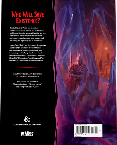 The notorious lich Vecna is weaving a ritual to eliminate good, obliterate the gods, and subjugate all worlds. To stop Vecna before he remakes the universe, the heroes work with three of the multiverse’s most famous archmages, travel to far-flung locales, and rebuild the legendary Rod of Seven Parts. Vecna: Eve of Ruin is a high-stakes Dungeons & Dragons adventure in which the fate of the multiverse hangs in the balance. The heroes begin in the Forgotten Realms and travel to Planescape, Spelljammer, Eberron, Ravenloft, Dragonlance, and Greyhawk as they race to save existence from obliteration.